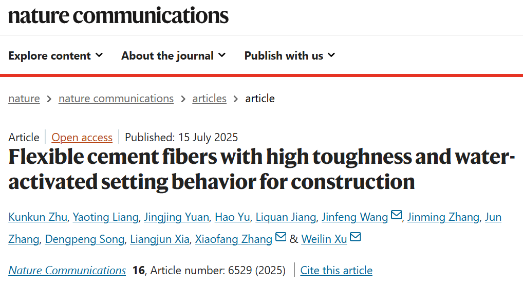 On July 15, the team published a groundbreaking study titled "Flexible cement fibers with high toughness and water-activated setting behavior for construction" in Nature Communications. The paper was first authored by Associate Professor Zhu Kunkun, with corresponding authors including Academician Xu Weilin, Professor Wang Jinfeng, and Professor Zhang Xiaofang. This research introduces a novel approach to fiberizing conventional cement, resulting in cement fibers that remain soft and weavable prior to hydration and rapidly solidify upon exposure to water. Notably, the flexural toughness of the resulting cement fiber fabric is enhanced by a factor of 20 compared to conventional plain cement boards. This innovation holds significant promise for addressing the inherent brittleness and cracking susceptibility of traditional cement, thereby opening new avenues for cement applications in challenging or specialized environments. Paper link: https://doi.org/10.1038/s41467-025-61855-2