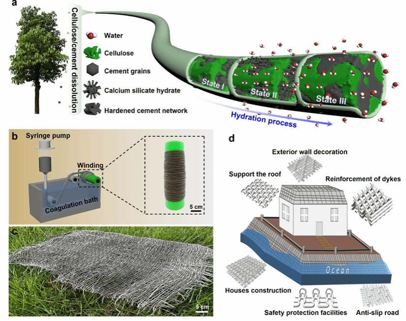 The research presents a scalable and straightforward wet-spinning method for the large-scale production of cellulose-based cement fibers, enabling in-situ embedding of cement within a cellulose matrix. Following hydration, the fibers develop into a cement-based composite featuring an interpenetrating double-network structure—comprising a rigid cementitious phase and a continuous cellulose network—with strong interfacial bonding. The resulting hydrated fiber fabrics demonstrate superior mechanical performance, particularly in terms of toughness and impact resistance, outperforming most existing cement-based composites. Importantly, these fibers can be readily processed via simple water-activated curing and seamlessly woven into complex three-dimensional architectures. Furthermore, the cement-based textiles exhibit a favorable combination of properties, including high toughness, excellent strength-to-weight ratio, lightweight nature, superior thermal insulation, effective water resistance, and compatibility with industrial-scale manufacturing. These attributes position the material for broad application potential across diverse fields such as civil engineering, architectural design, hydraulic engineering, artistic installations, and decorative construction.