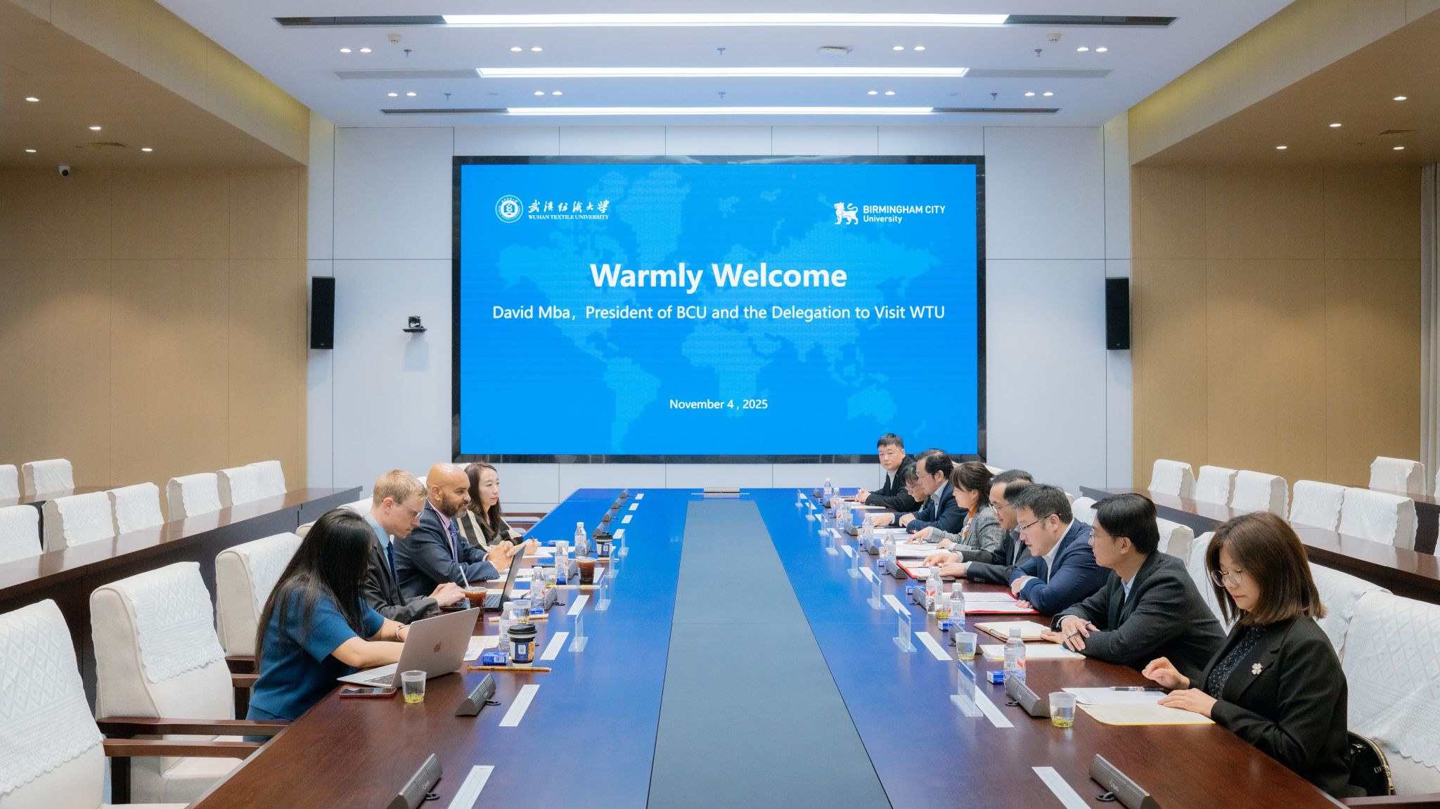 On November 4th, Professor David Mba, Vice-Chancellor of Birmingham City University in the UK, led a four - member delegation to pay a visit to WTU. Party Secretary Xu Weilin and President Fu Xin of WTU met with the British guests in the Chongzhen Hall of Jianquan Auditorium. Vice President Wang Dong chaired the meeting, and officials from IO and BIFCA of WTU participated in the exchange.